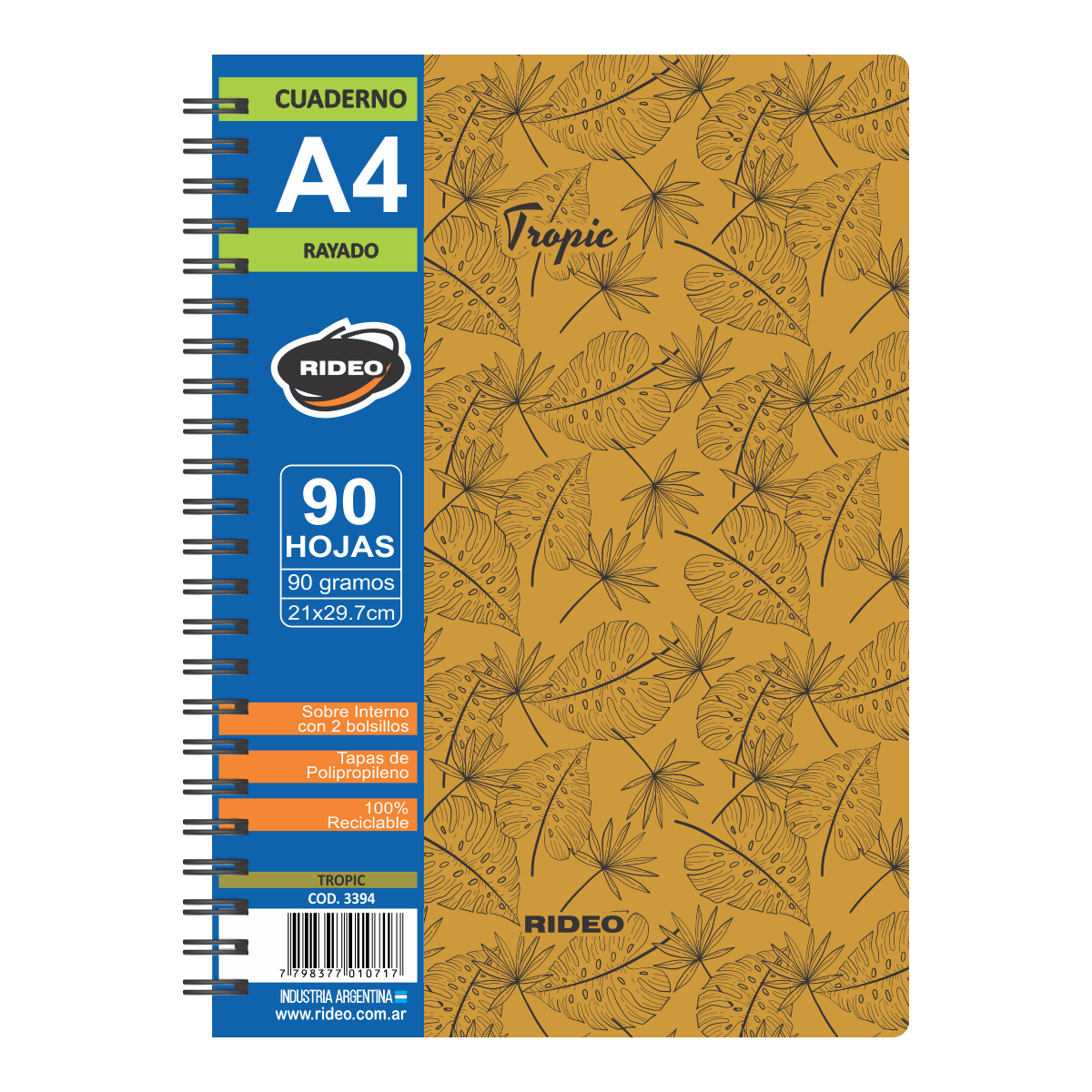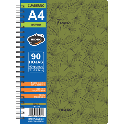 Cuaderno Espiralado A4 tapas plásticas Tropic x90 hojas rayadas Rideo