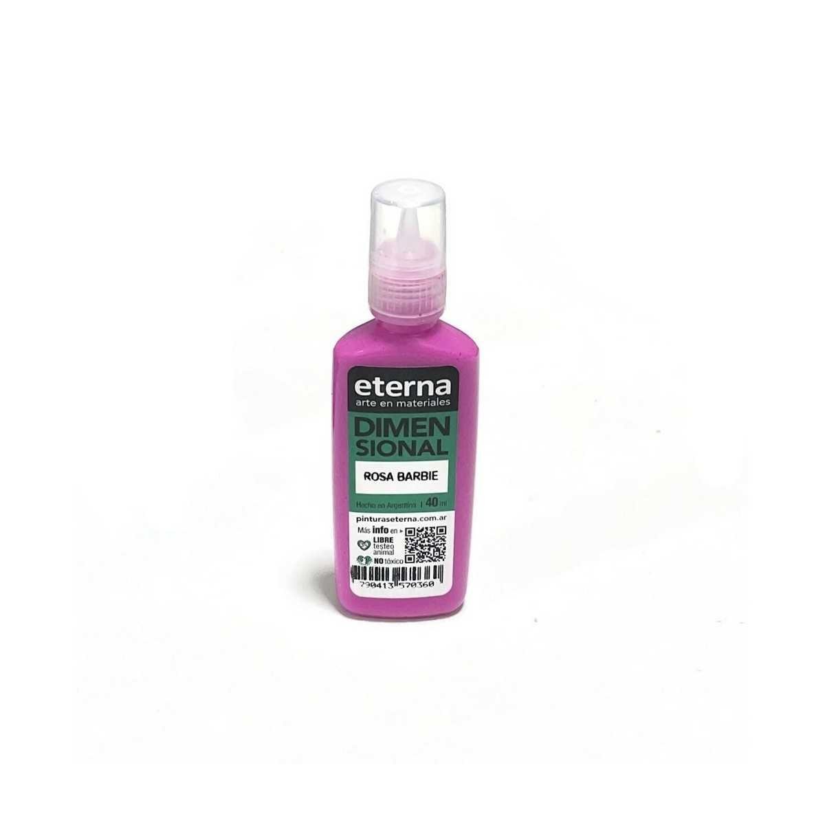 La Pintura Dimensional Eterna es pintura acrílica al agua, especialmente creada para lograr obras con relieve. Se presenta en pomos con práctico pico aplicador. Ideal para trabajar sobre múltiples soportes flexibles como telas y cueros naturales o sintéticos, goma EVA, papel, cartón y corcho, entre otros. También puede aplicarse sobre superficies rígidas como madera, telgopor, yeso, cerámica, vidrio, etc. La Pintura Dimensional Eterna se caracteriza por su elasticidad, excelente adherencia final y resistencia a lavados suaves. Los elementos de trabajo pueden lavarse con agua antes de que se hayan secado. Si el pico aplicador se obstruyera con pintura seca, puede destaparse pasando un alambre delgado desde adentro hacia afuera.