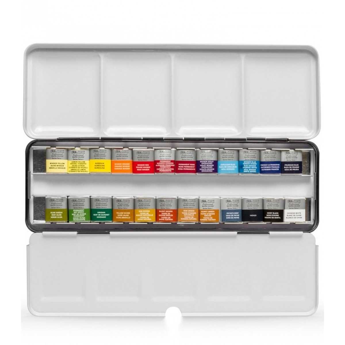 Set de acuarelas en pastillas Cotman. Presentación en elegante caja de metal ligero conteniendo 24 colores cuidadosamente elegidos, los cuales pueden ser desmontados y reemplazados a gusto del artista.
