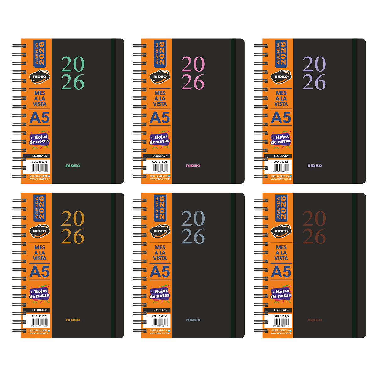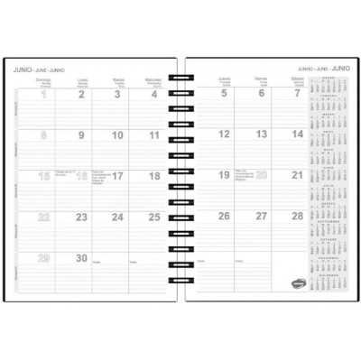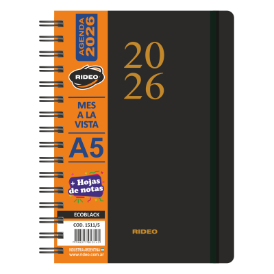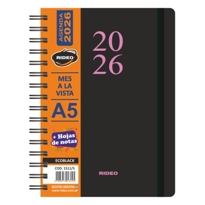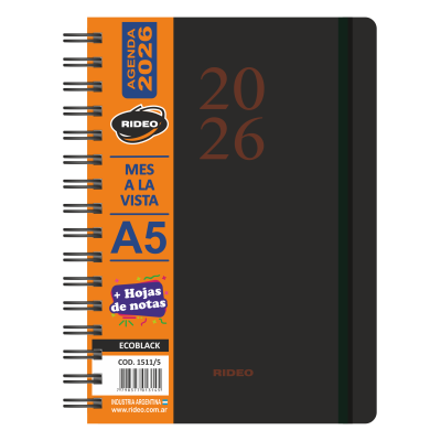 Agenda Rideo A4 con espiral, tapas de PVC, sobre de cartulina, hojas para notas y cierre con elastico. Mes a la vista. Medida: 29,9x 21cm. Modelo: ECOBLACK y numeros de color blanco