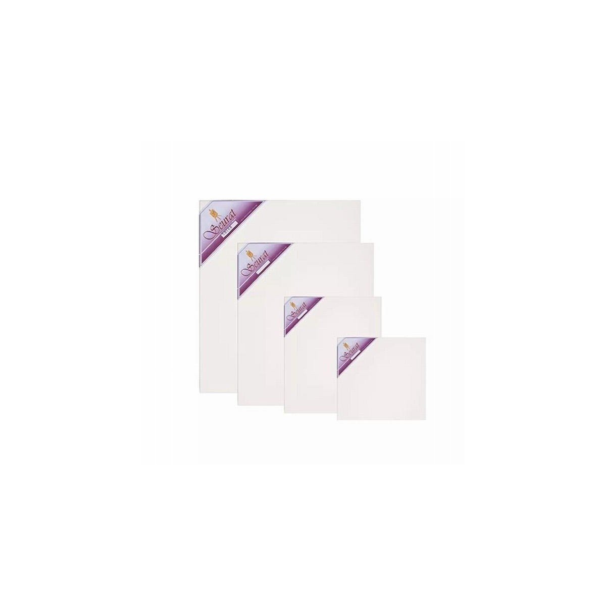 Bastidor Seurat con tela 03 de doble imprimación fabricado con madera estacionada producida en plantaciones propias con normas de sustentabilidad ecológica y forestal. Sistema de tensado de tela realizado por 4 cuñas que permiten regular la rigidez deseada. El anclaje de la tela se realiza a través de ganchos inoxidables en la parte trasera del bastidor para permitir el pintado lateral del mismo por el artista. Gran variedad de tamaños.