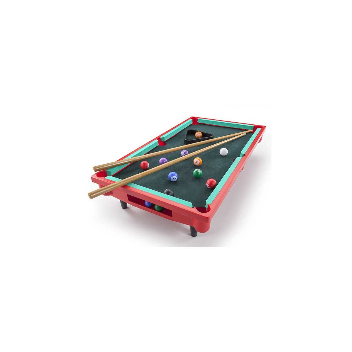 Contiene: 1 mesa, 12 bolas, 1 triángulo, 2 tacos