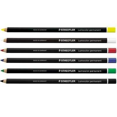 Lápiz permanente resistente al agua a y adecuado para casi cualquier superficie tal como vidrio, cuero, tela, piedra, metal, madera, plástico. Los colores son intensos y resistentes a la luz con pigmentos no corrosivo. El tramo es opaco y es adecuado para uso en superficies claras, oscuras y transparentes. No se seca y no penetra en el papel.