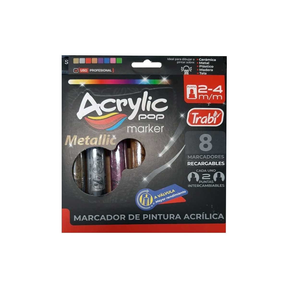 Set de marcadores acrílicos c/2 puntas redonda y biselada de 2-4 mm x 8 colores metalizados TRABI