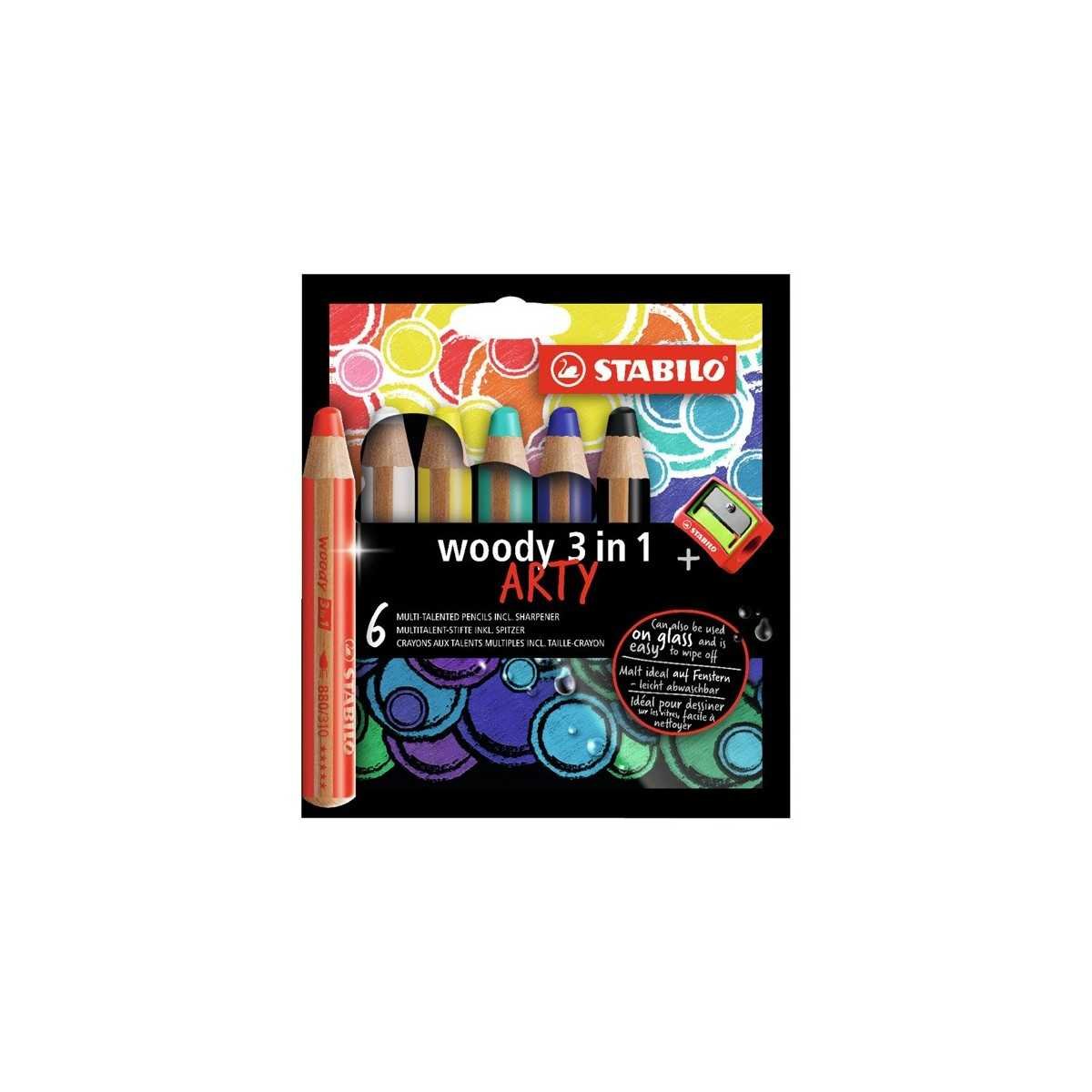 Contiene 1 unidad de los siguientes colores: Blanco 100, Amarillo 205, Rojo 310, Ultramar 405, Turquesa 470, Negro 750 y 1 Sacapunta STABILO para WOODY. Lápiz con mina de 10mm. de diámetro (equivale a 12 lápices comunes). Diseño grueso que permite controlar la motricidad fina en los niños. Es la "PINTURA" clásica, el crayon de cera, gran cantidad de pigmento con característica acuarelables y que permite usarse para maquillaje (Fútbol, halloweens, clown,etc.)