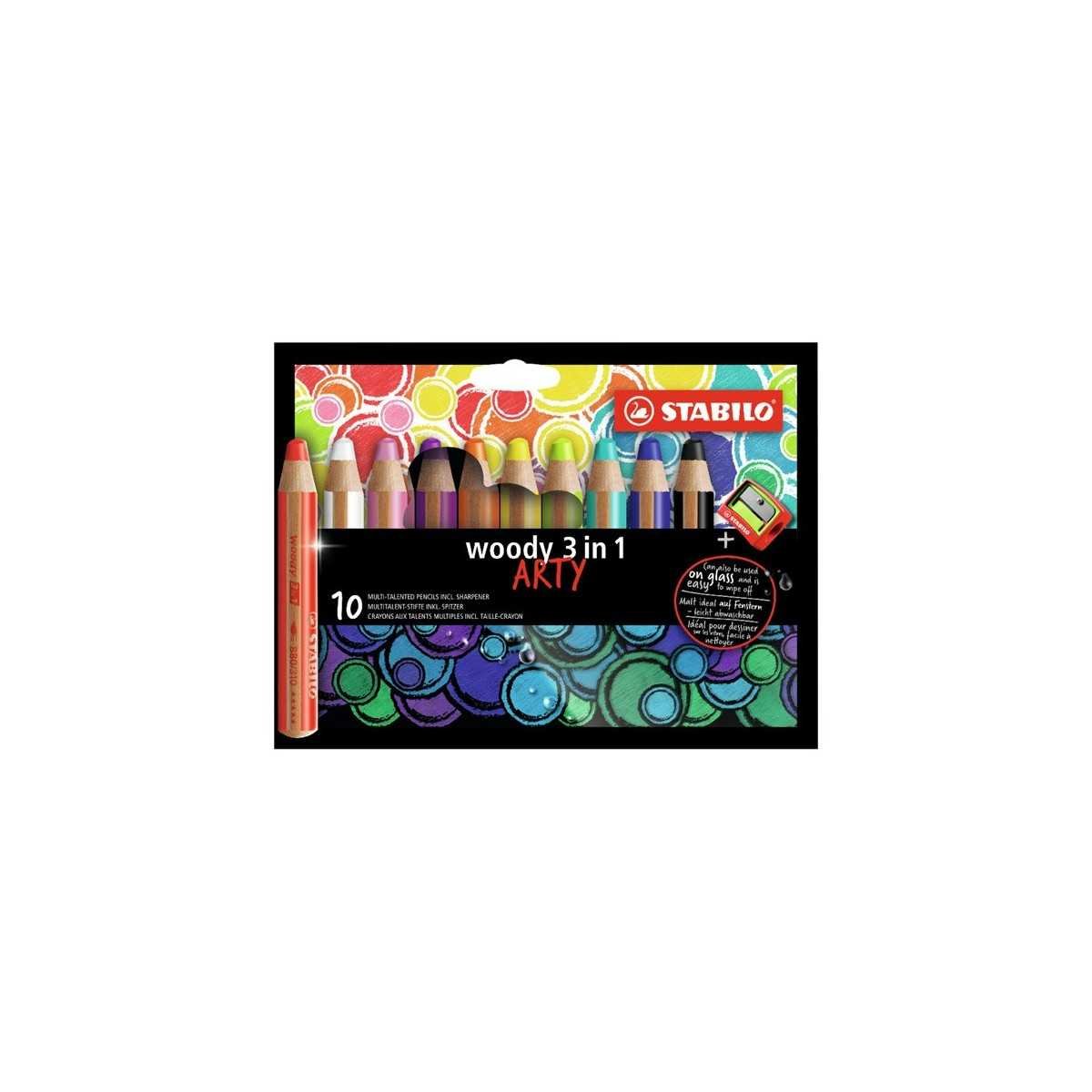 Contiene 1 unidad de los siguientes colores: Blanco 100, Amarillo 205, Naranja 220, Rojo 310, Rosa 334, Lila 370, Ultramar 405, 1 Turquesa 470, Verde Claro 570, Negro 750 y 1 Sacapuntas STABILO para WOODY. Lápiz con mina de 10mm. de diámetro (Equivale a 12 lápices comunes). Diseño grueso que permite controlar la motricidad fina en los niños. Es la "PINTURA" clásica, el crayon de cera, gran cantidad de pigmento con característica acuarelables y que permite usarse para maquillaje (Fútbol, halloweens, clown,etc.)