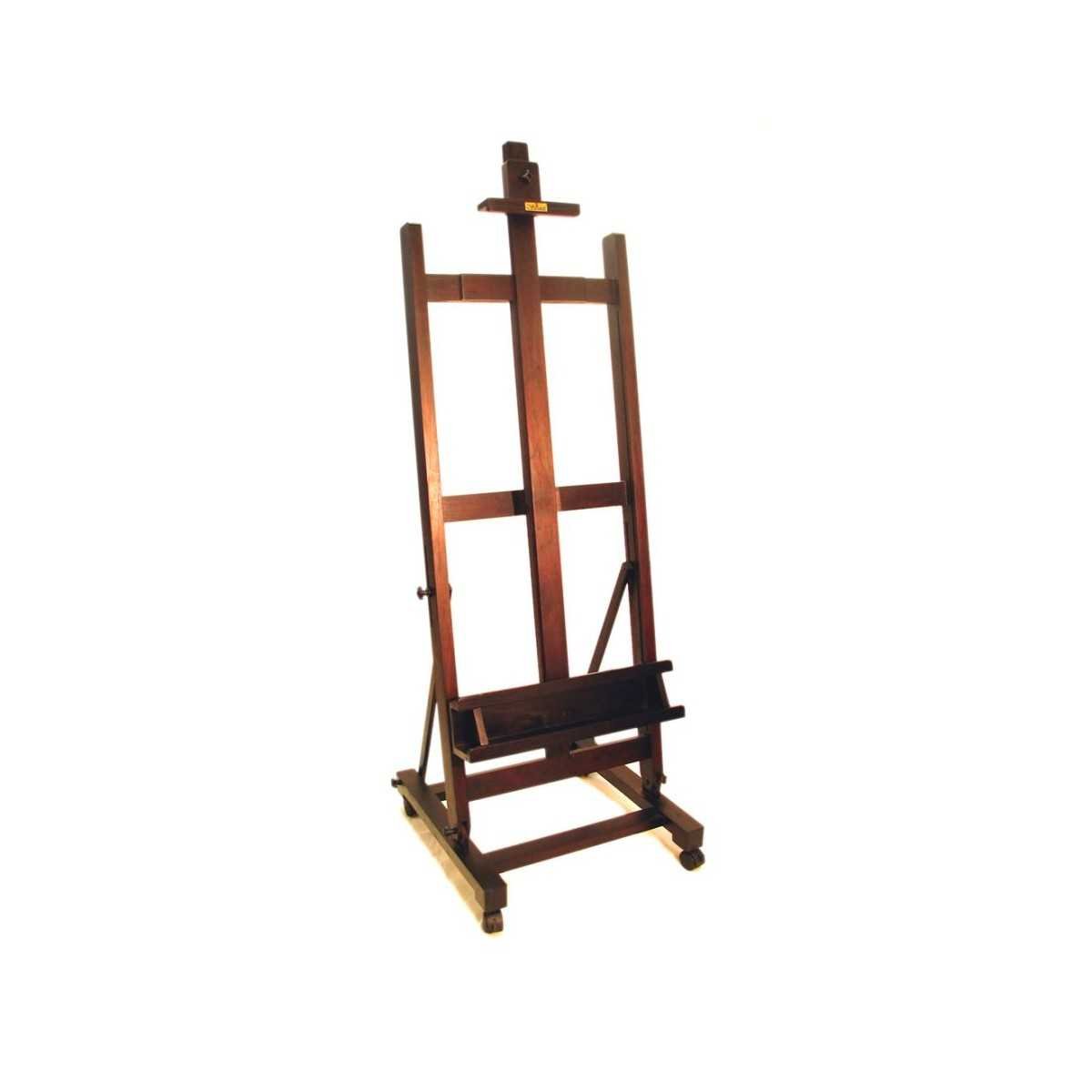 Atril vertical regulable a cremallera. Pino canadiense lustrado y laqueado color caoba. Base cuadrada con ruedas, posición unicamente vertical, sistema de regulación a varilla roscada con manija, Medidas: 96 cm de ancho x 200 cm de altura, Recomendado para artistas profesionales por aptitud para grandes medidas.