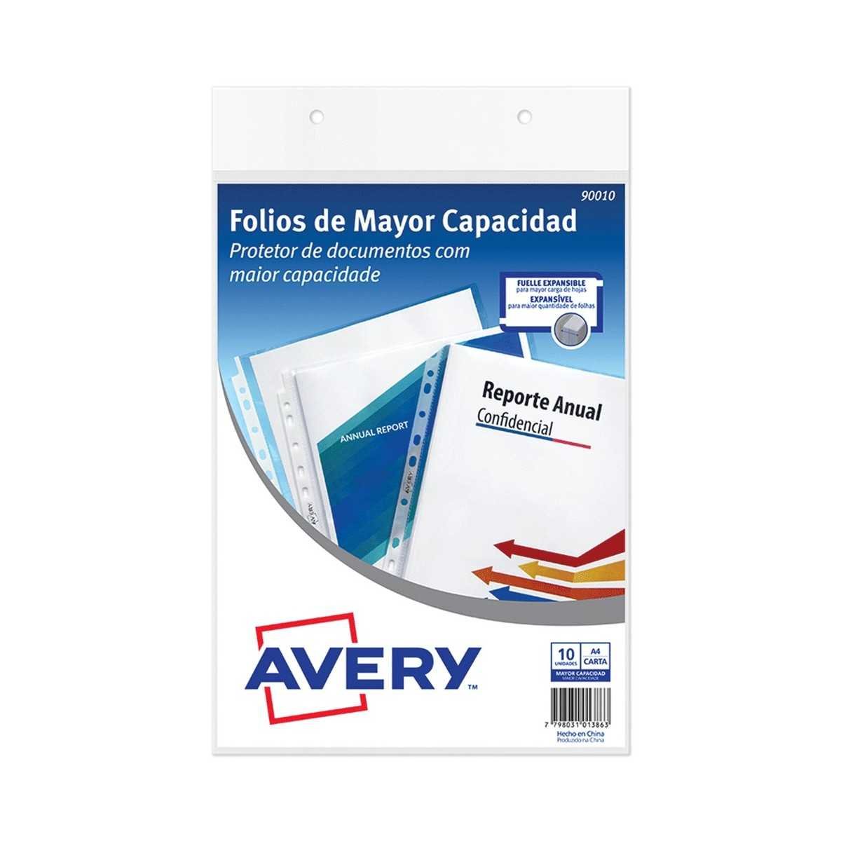 Folios Avery Especiales Mayor Capacidad. 90 micrones. Pack de 10 folios. Capacidad hojas A4 y Carta. De gran transparencia y resistencia. Multiperforados. Ideales para presentaciones y uso intenso