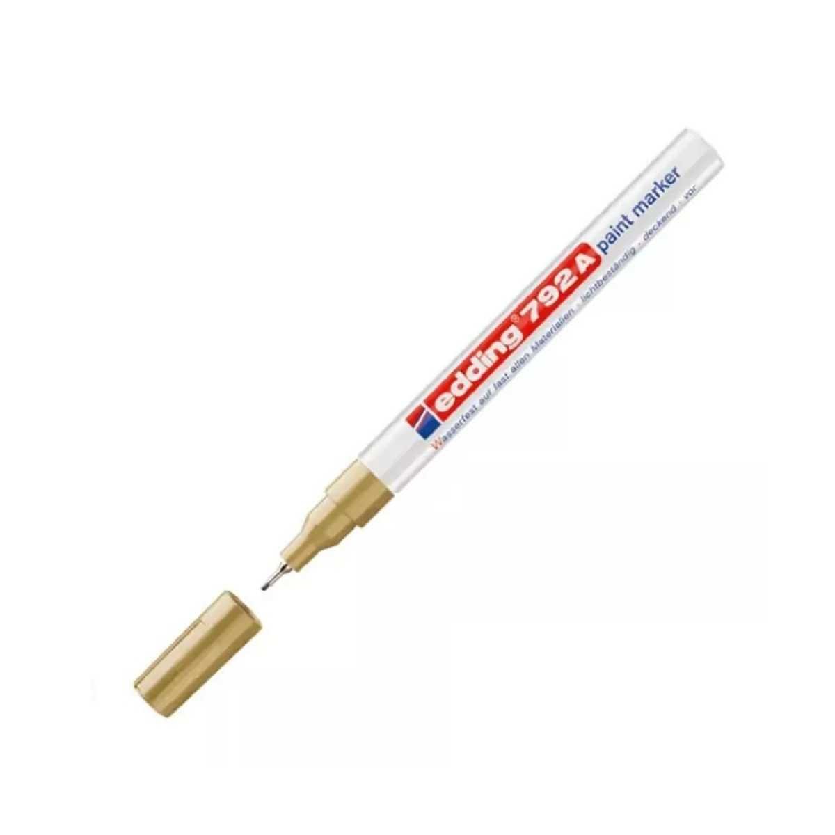 Marcador permanente Edding E792 Paint Marker en color oro. Tinta opaca con efecto lacado. Cuenta con punta engastada en metal, grosor del trazo 0.8 mm. Adhesión sobresaliente especialmente sobre superficies lisas, oscuras y transparentes. Producto extremadamente resistente al desgaste en la mayoría de superficies gracias a la tinta resistente al agua y de secado rápido. Ideal para una escritura y decoración permanentes