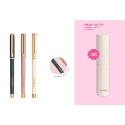 Bolígrafo con tapa y tinta azul, con acabado mate soft touch . Incluye estuche de tubo con tapa para un toque elegante y sofisticado. El precio publicado corresponde a una unidad.