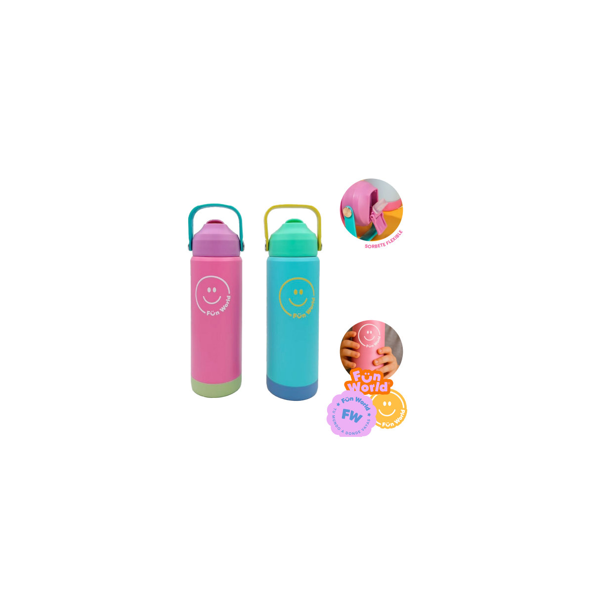 Botella Fun World de acero inoxidable con capacidad de 500 ml,de doble pared con funda de silicona. Mantiene la temperatura hasta por 12 horas, es a prueba de fugas y tiene un pico práctico, ideal para niños. Libre de BPA. El precio corresponde a una unidad.
